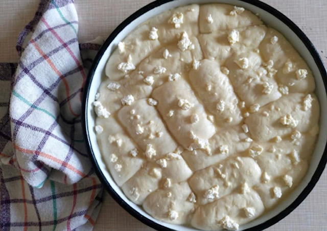 Во смесата додајте 5 лажици кајмак, па откако ќе промешате и ќе се изедначат состојките, додајте и 300 г меко, младо сирење. Иситнете го сирењето па додајте 200 мл газирана вода. Промешајте кратко. Од половина килограм кори одвојте две, а остатокот отворете ги на работна површина, па со остар нож исечете ленти со широлина од 2-3 см.