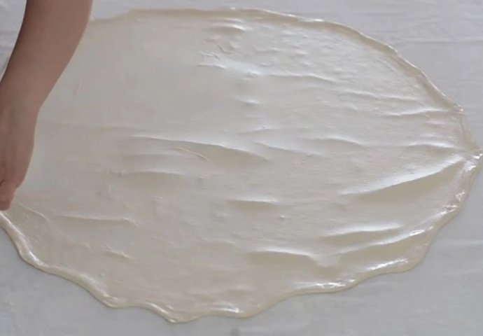 Валаните, подмачкани и одморени топчиња, едно по едно, ставете ги на работната површина и почнете внимателно да ги растегнувате во сите правци.