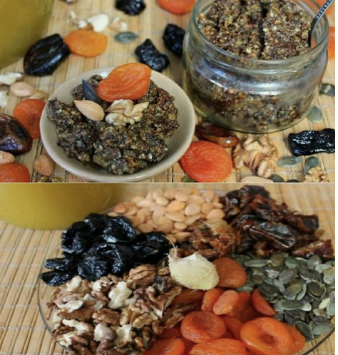 Ставете по 200 г од сите состојки и еден органски лимон со кора. Состојките сомелете ги во машина за мелење месо (или ситно исечкајте ги), додадете мед, промешајте и складирајте во стаклени тегли.
