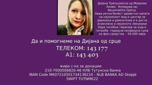 Драги хумани луѓе јас Дијана Т.боледувам од ретка болест Neuromilit Optucus болест која поради нејзината сериозност доведува до заматен вид(губење на видот и отежнато движење),за подобрување на состојбата потребна е соодветна терапија која чини доста скапо,за тоа ми е потребна вашата хумана рака…