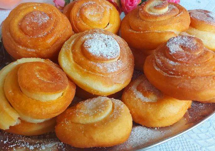 Премачкајте со путер и виткајте во ролат и добро соберете ги рабовите. Исечете тенки кифлички со остар нож. Се остава да отстои 15 минути и се пржи на длабоко масло. По желба посипете шеќер во прав и ванилин шеќер.