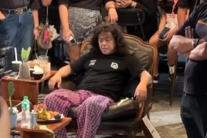 Додека седи на фотелја од осумдесетите, околу него има цигари, кафе и алкохол. Под неговите нозе во куќни влечки има тепих сличен на пиротскиот тепих, а тој е облечен во пижами.