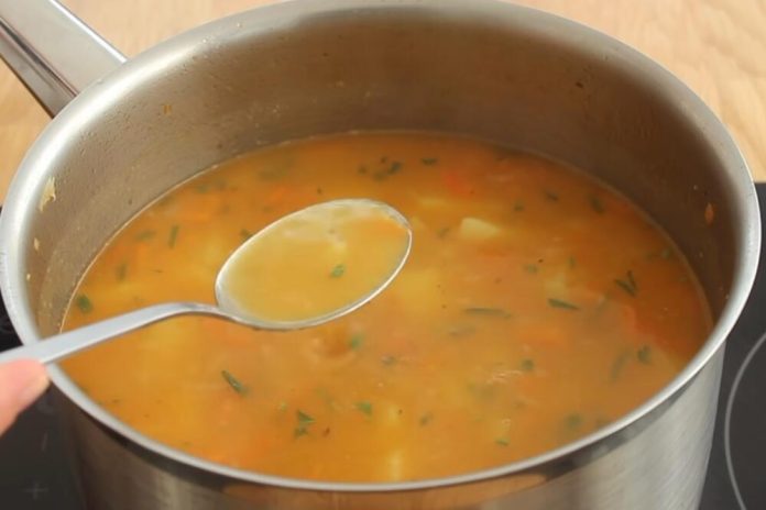 После тоа, таа полила брашно и мешала додека не се добие густа паста. Инаку, додека мешате, додадете ја пилешката супа, па покријте сè и оставете да се готви неколку минути.