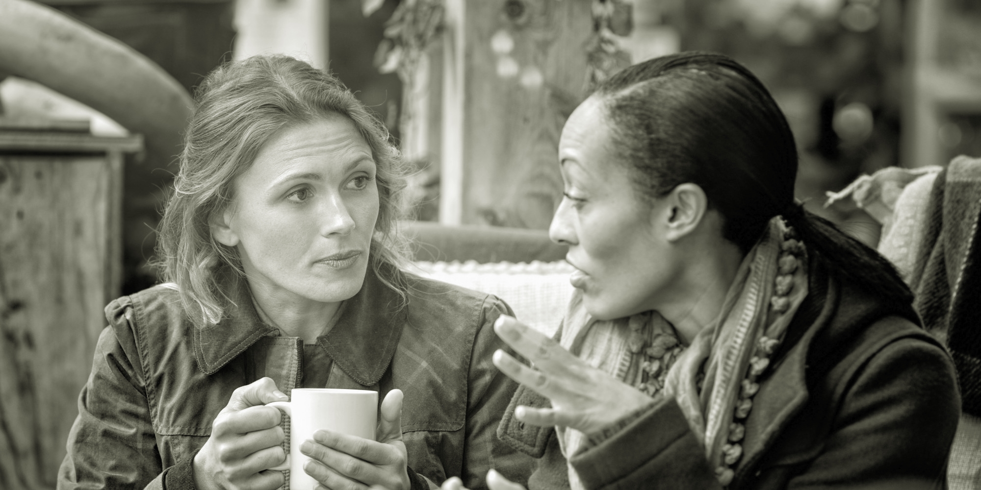 Two female friends discussing over a cup of coffee