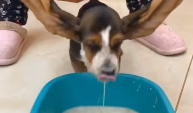 Ушите на ова куче се толку големи што сигурно би ја препливале неговата храна доколку нема помош.