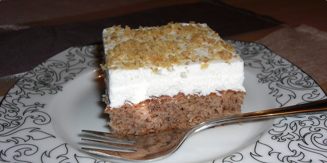 • Јајцата и 6 лажици шеќер се матат, се додаваат презла, прашокот за пециво и оревите, се меша се заедно додека сè не се соедини не се обединуваат. Истурете во подмачкана тава и печете на 180 околу 20 минути.
