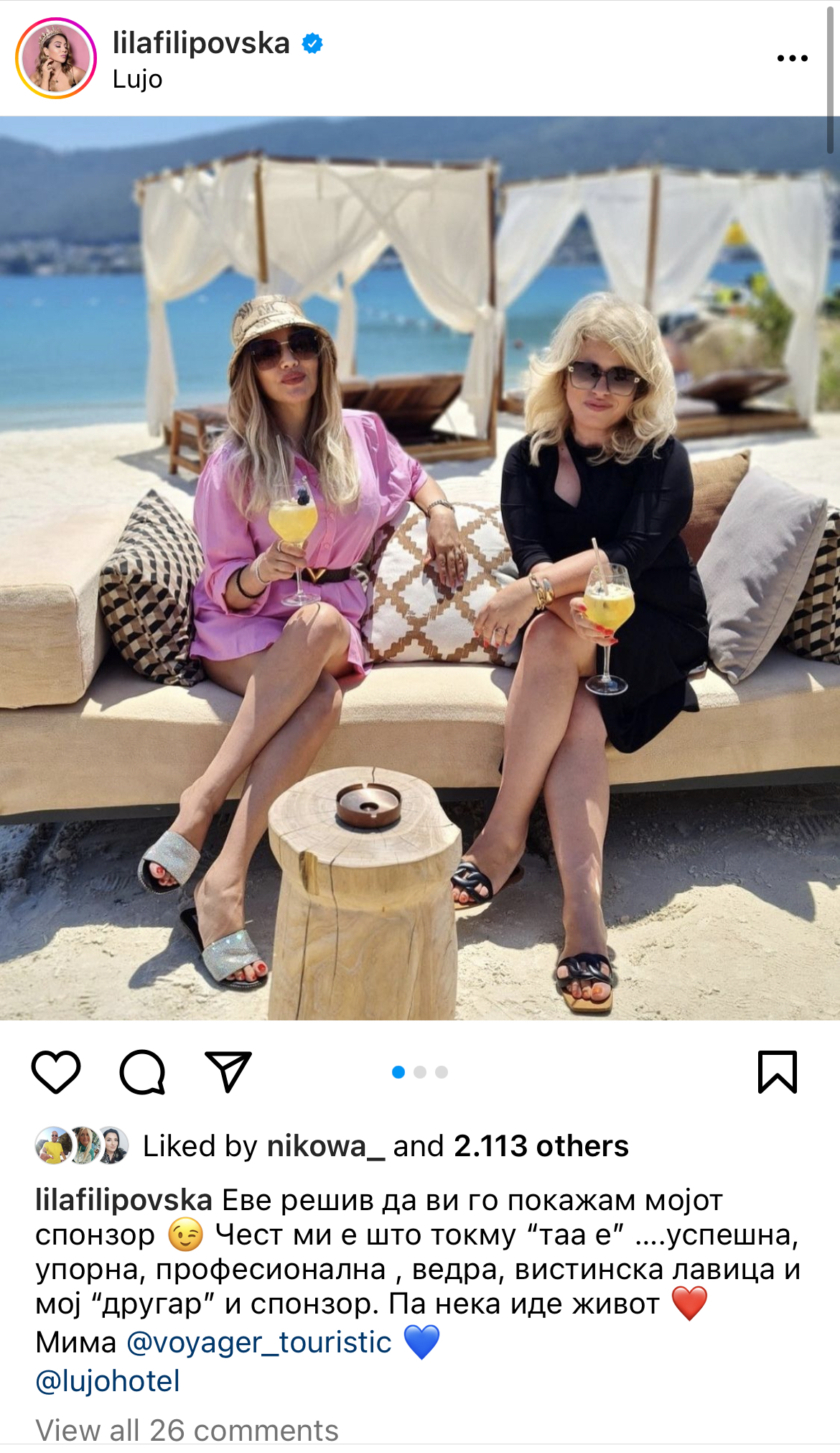 Лила сака да биде транспарентна и од тие причини реши да сподели со јавнсота кој и е спонзорот кој и ги приуштува скапите одмори. На Инстаграм профилот напиша: