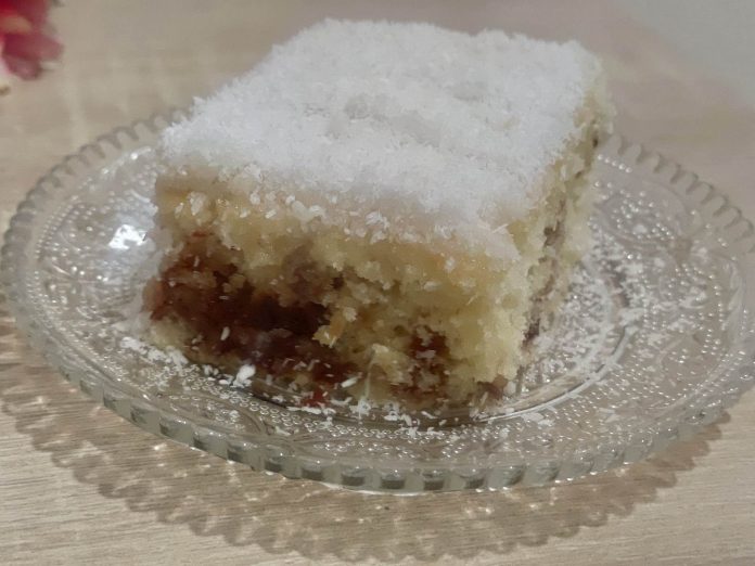 Половина од смесата истурете ја во голема тава премачкана со путер, а потоа ставете го џемот од сливи (следете ги упатствата во видеото) и остатокот од смесата прелијте го врз џемот.